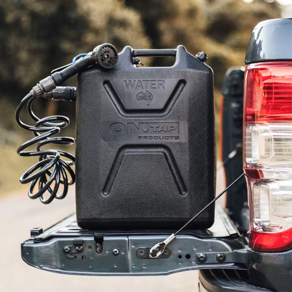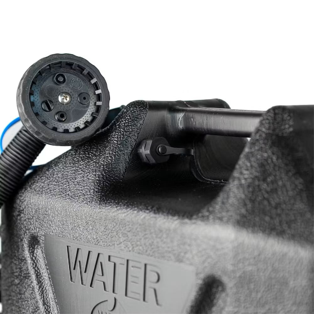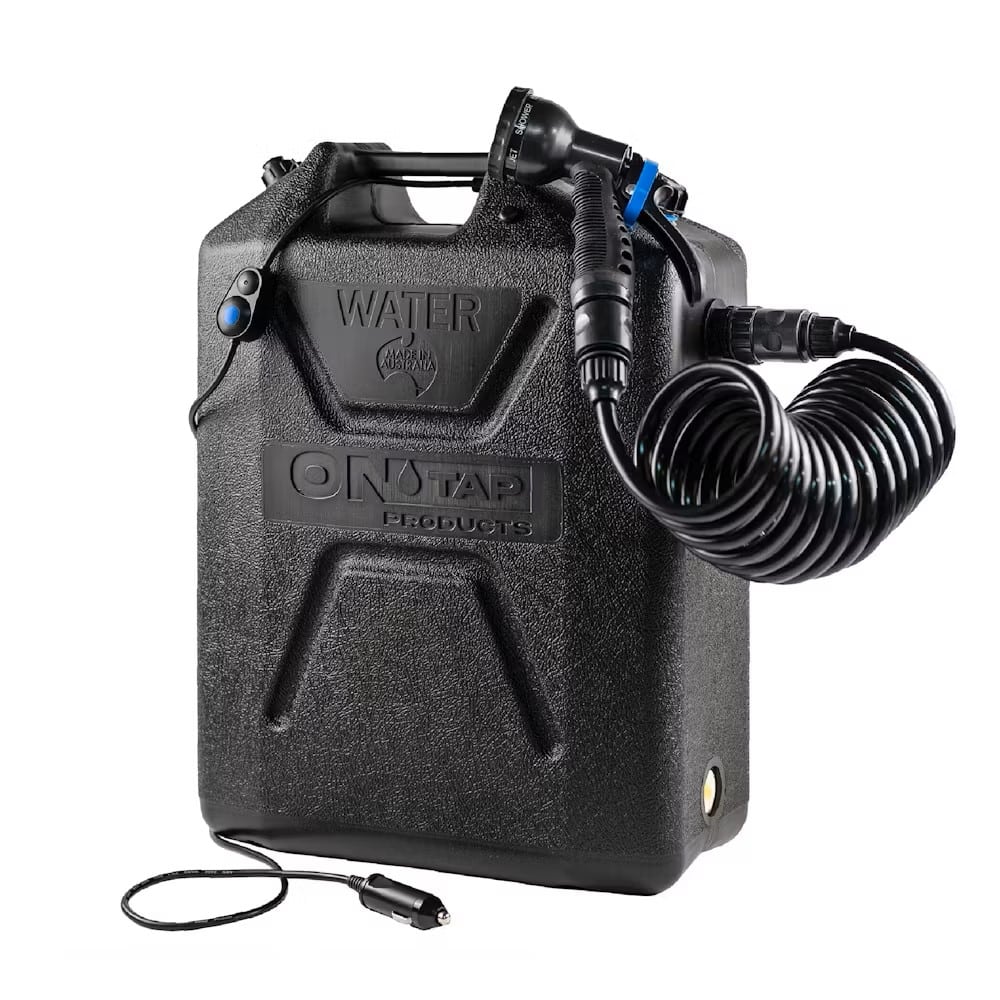 Bidão portátil de 22 litros com um chuveiro de 7 modos, alimentado por uma bomba interna de 12V.